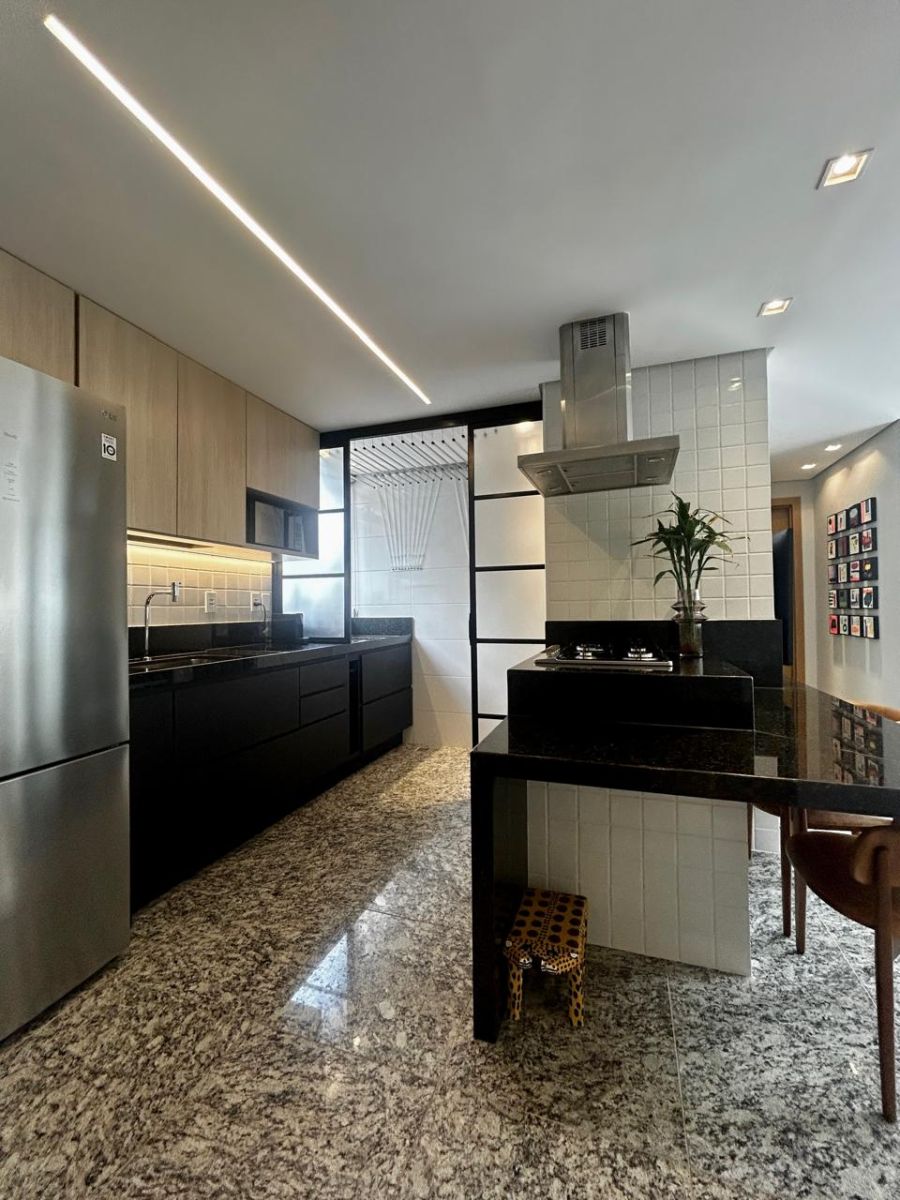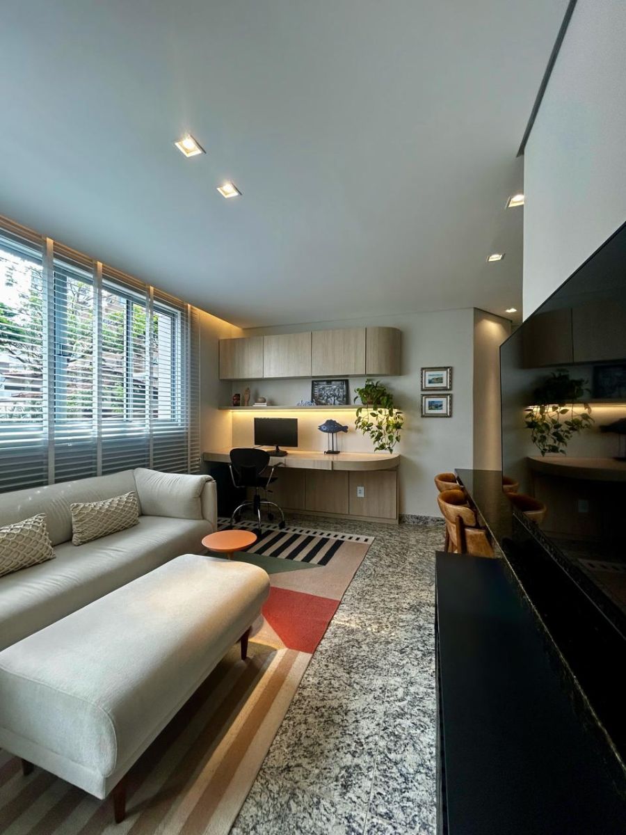 O ambiente com arquitetura contemporânea, iluminação planejada e marcenaria sob medida.